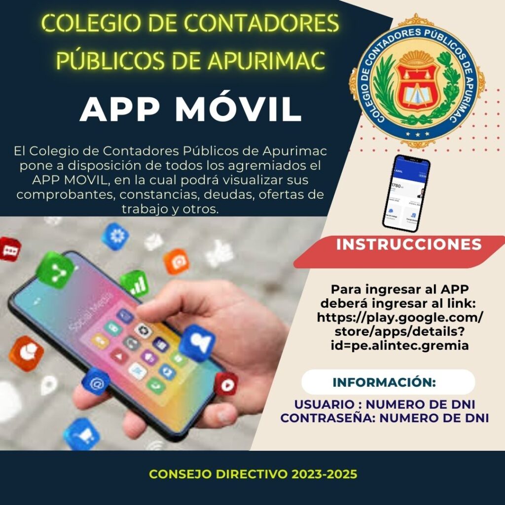 APP MOVIL DEL CCP DE APURIMAC El Colegio de Contadores Públicos de Apurimac pone a disposición de todos los agremiados el APP MOVIL, en la cual podrá visualizar sus comprobantes, constancias, deudas, ofertas de trabajo y otros. Descargar en el siguiente link. https://play.google.com/store/apps/details?id=pe.alintec.gremia&pcampaignid=web_share